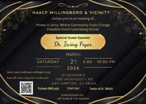 The Willingboro & Vicinity NAACP Branch is hosting our First Annual Freedom Fund Dinner which is scheduled for March 21, 2026. This year’s theme is Power in Unity: Where Community Fuels Change. The event will be held at O’Conner’s American Bar & Grill, located at 1383 Monmouth Rd, Eastampton Township, from 6pm until 10 pm. Price: $85 per ticket, Includes: Buffet dinner, live music by Jeff Jones and the Jazzmen, Guest Speaker: Dr. Irving Fryer